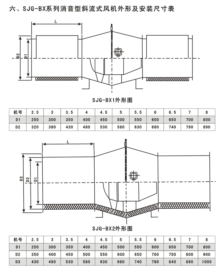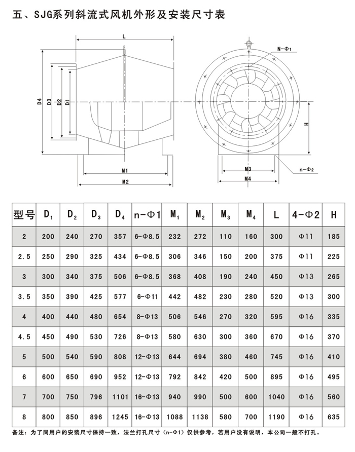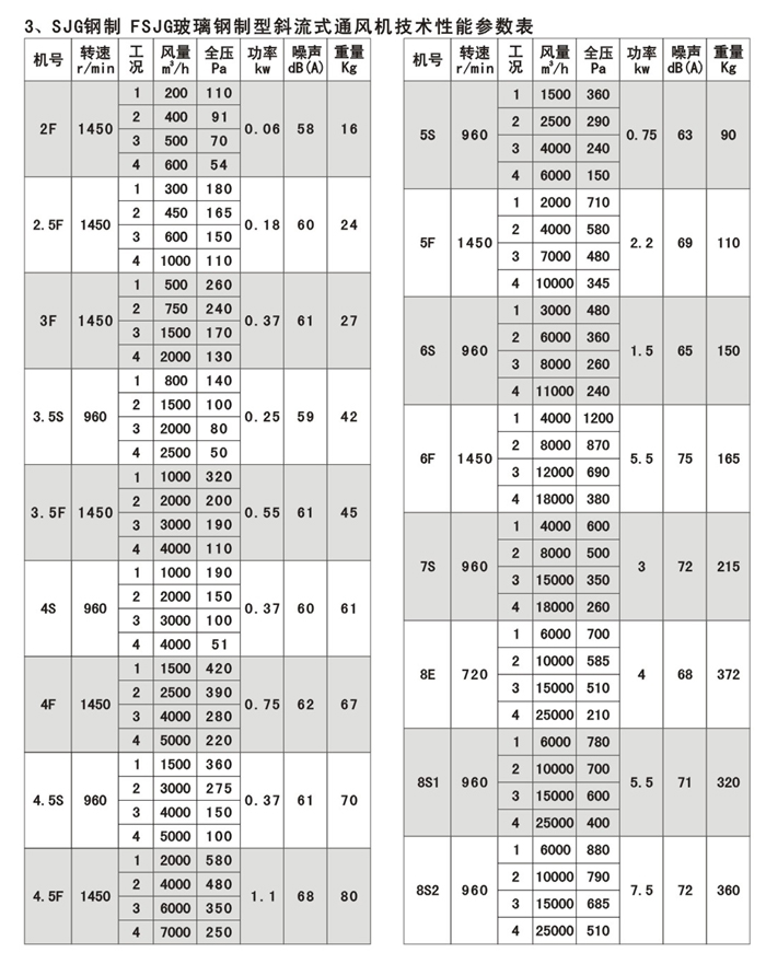 SJG系列斜流式通風機按葉輪直徑分為200-800mm十幾種規(guī)格、十幾個機號,風量由200-2500m3/h,全壓由50-1200Pa;具體數(shù)據(jù)請查風機性能參數(shù)表。