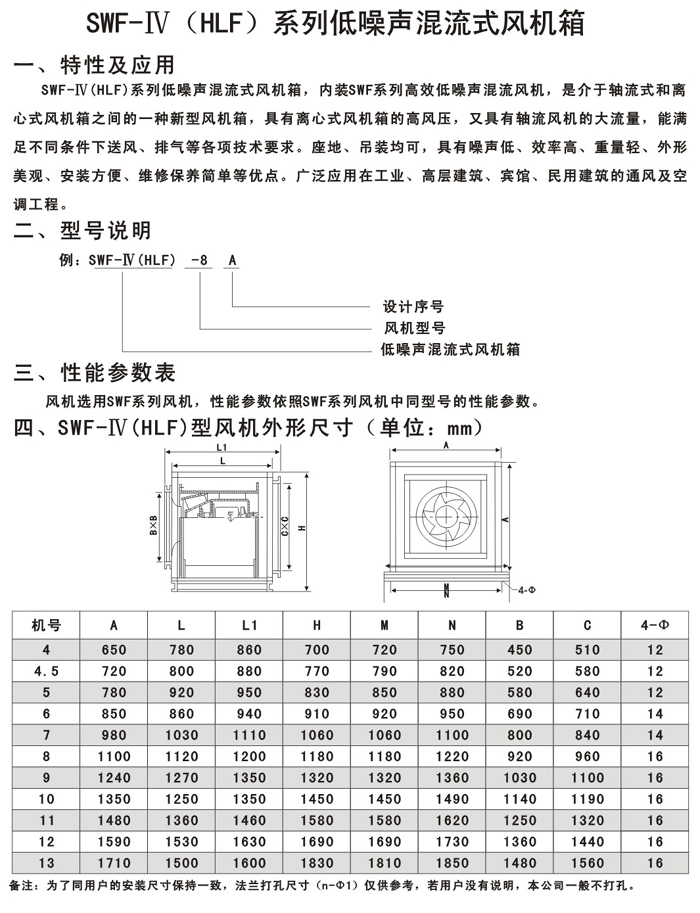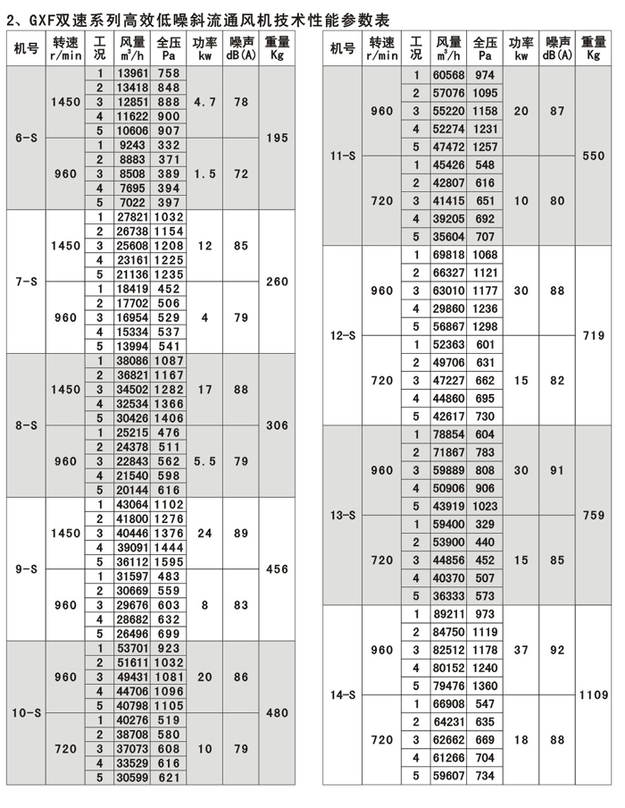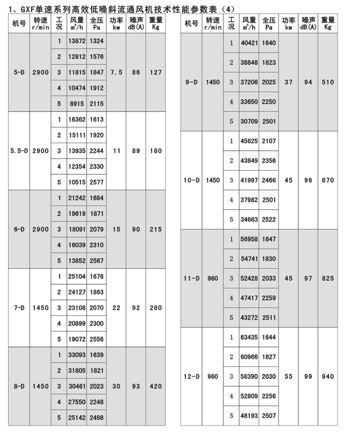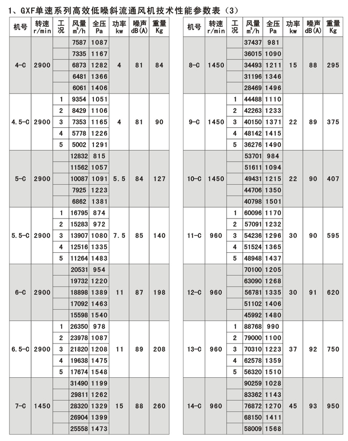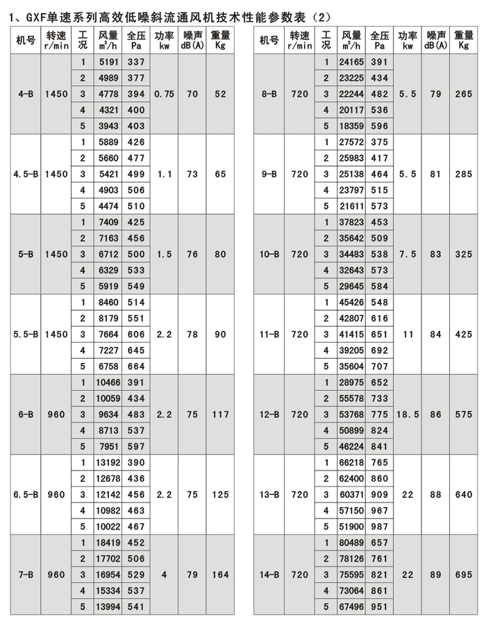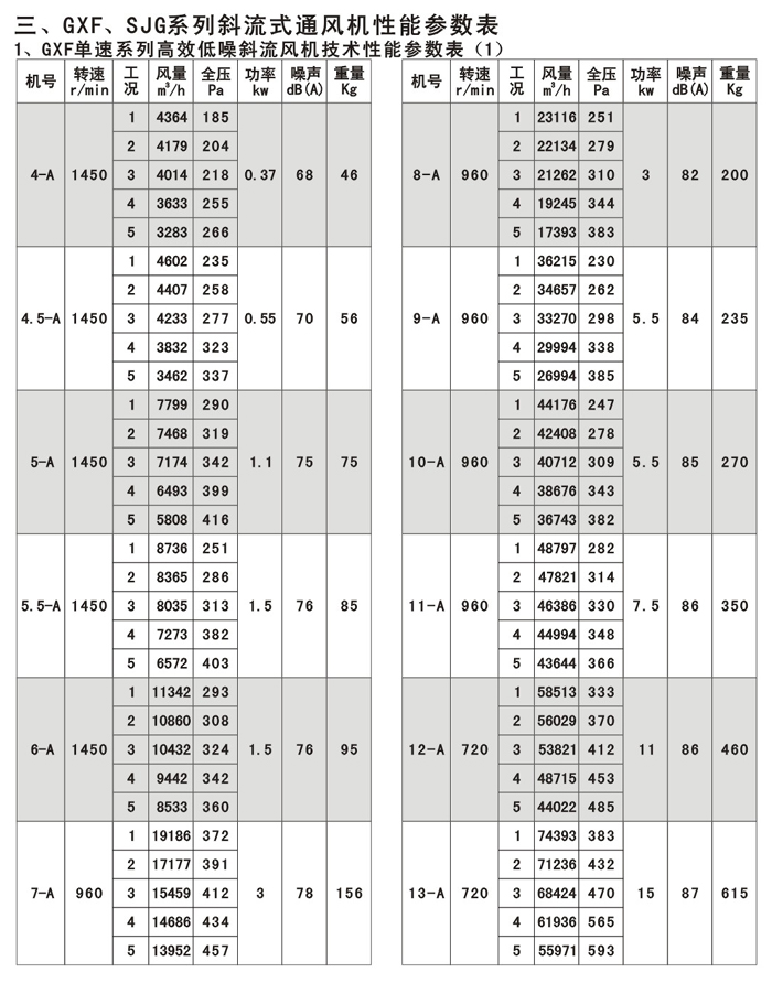 GXF系列斜流通風機按葉輪直徑分為400-1400mm十四規(guī)格,按類型分為A、B、C、D、S五種類型,共五十八個機號。風量由3000-90000m3/h,全壓由185-2500Pa;這樣就給設計部門和用戶單位提供了充分的選擇條件,具體數(shù)據(jù)請查風機性能參數(shù)表。