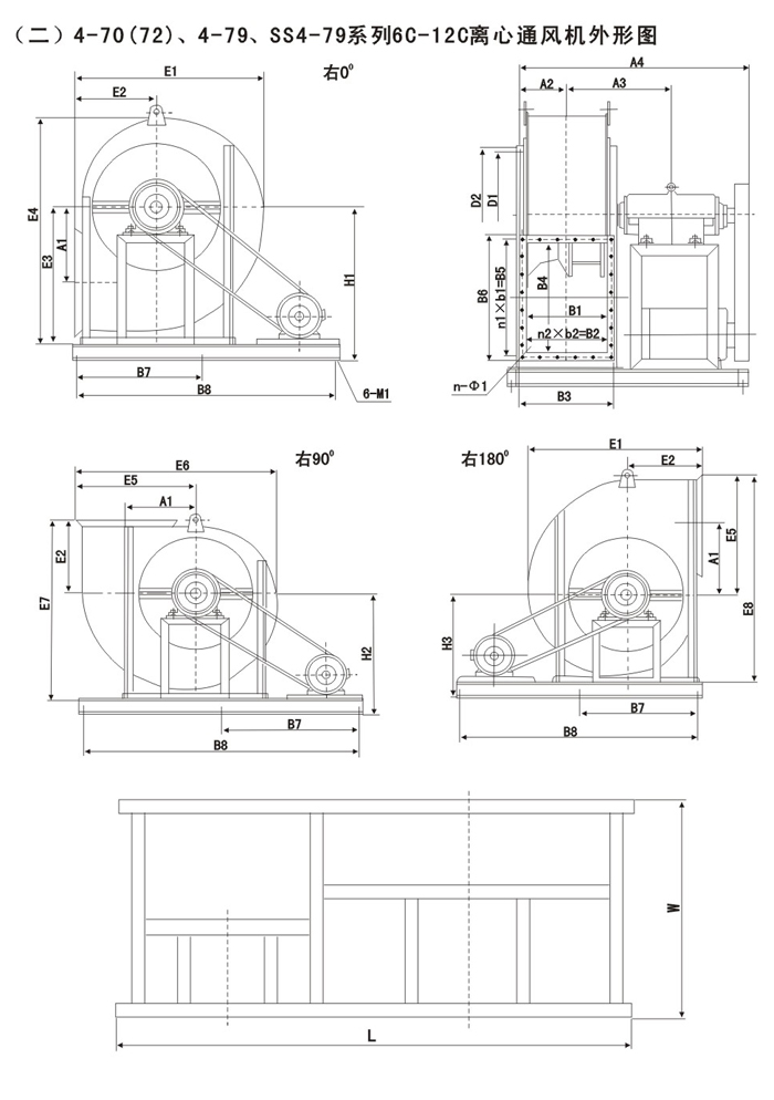 4-72,4-79,SS4機-79系列離心風(fēng)機作一般通風(fēng)換氣用,輸送空氣或其它不易燃易爆,無腐蝕性的氣體,氣體內(nèi)無粘性物質(zhì),所含的塵土及硬質(zhì)顆粒物不大于150mg/m3,溫度不超過80攝氏度。